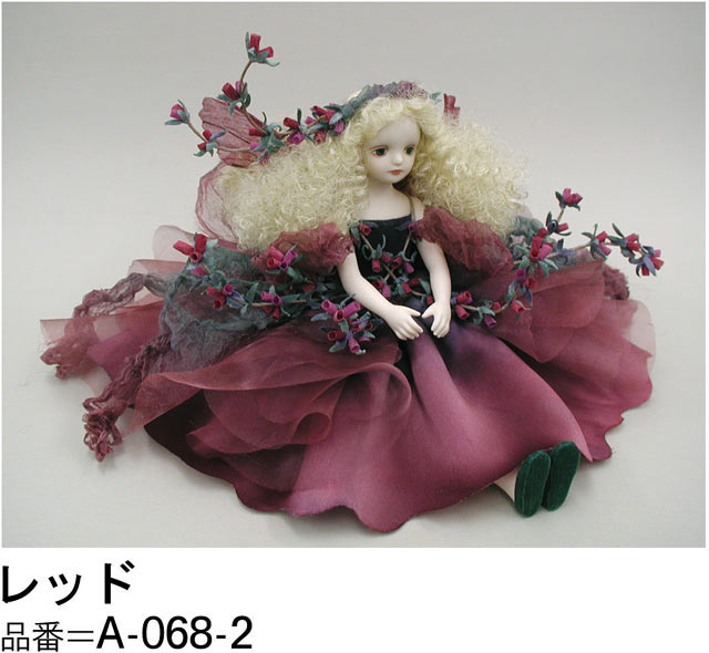 サイズ(平均):幅23×奥行23×高さ14cm 頭部:ビスク ボディ:ビスク 手・足:ビスク ウィッグ:絹もしくはレーヨン ドレス:レーヨン・木綿・その他の布 花:レーヨン・木綿・その他の布 その他・付属品:サシェ(香り袋) 顔のメイク:アクリル絵の具で描画(描画後焼成していません) ドレス:アートフラワーの技法による糊付けと縫製 染色:シリアス染料による手染め |
